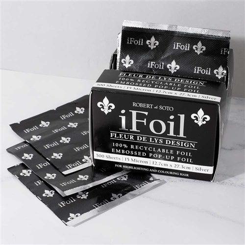 Fast and easy foil with style. Robert de Soto makes hairdressing foil super convenient with his iFoil Embossed Pop-Up in Fleur De Lys. Embossed with a fleur de lys design, this 100% recyclable foil is all about ensuring colouring and highlighting is easy and efficient. The tissue box style dispenser contains 500 sheets of 15 microns each. No cutting, no hassle!