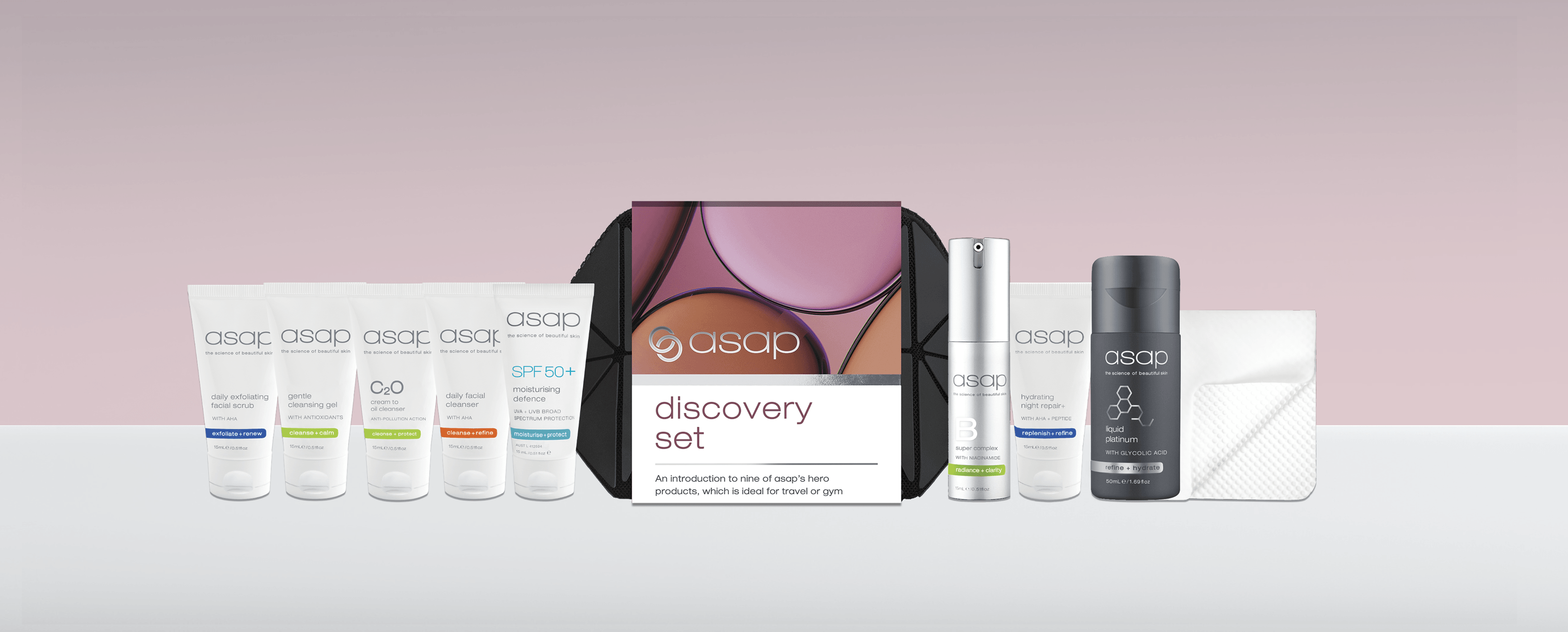 Discovery Kit is the ultimate introduction to nine of asap's hero products, offering a complete skincare routine in a convenient travel-sized set. Perfect for trial, travel, or gym use, this kit includes cleansers, treatments, and hydrating essentials to target all your skin needs. Designed to cleanse, exfoliate, hydrate, and protect, deliver a smooth, radiant complexion wherever life takes you.