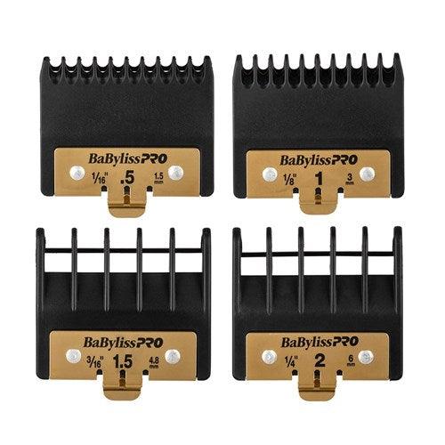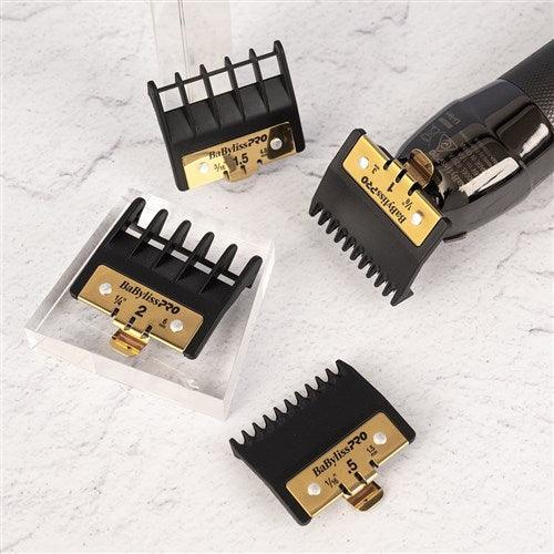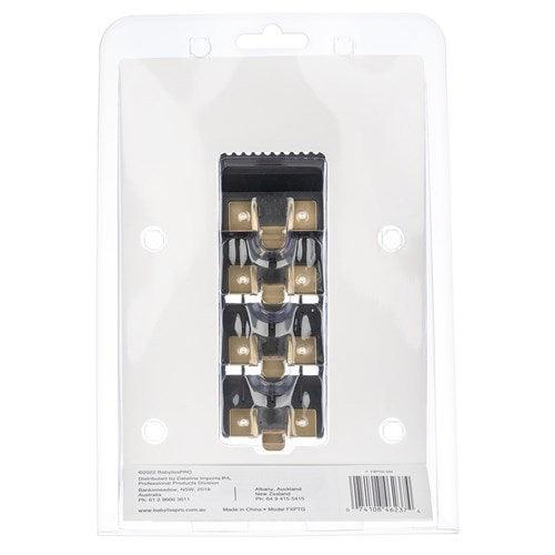 BaBylissPRO Premium Hair Trimmer Guards for all BaBylissPRO FX787 lithium trimmers. Use your trimmer with four different levels of length cutting, just like your clipper. Made from fibreglass-reinforced nylon for strength and durability, these professional trimmer guard accessories will not rub when the trimmer blade is zero gapped. Gold metal clip securely attaches your chosen guard to the trimmer.