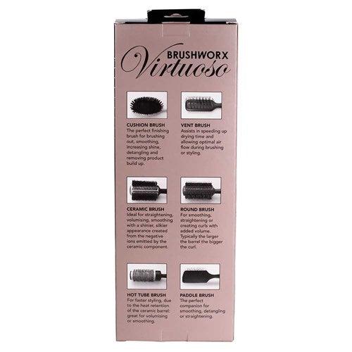 Smoother, Silkier, Shinier A Virtuoso of the hairstyling world. With beautiful rose gold finish, the Brushworx Virtuoso range enhances smoothness, silkiness and shine. Brushworx Virtuoso Paddle Brush is great for detangling, wonderful for smoothing and terrific for straightening. The large cushion base is designed for superior straightening, while the nylon bristles effortlessly detangle. Lightweight,...