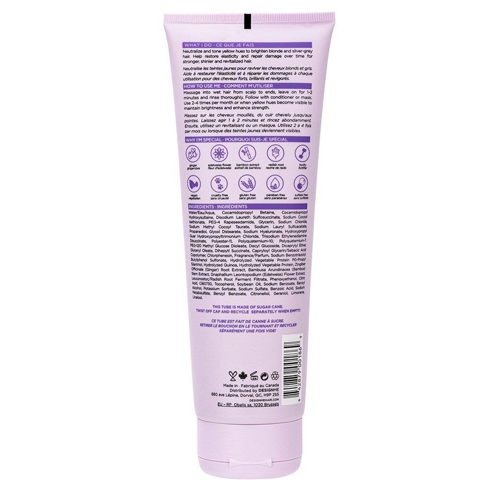 What I do: Revitalise hair for a cooler, brighter blonde. Blonde Fortifying Purple Shampoo features purple micro pigments which neutralise yellow and brassy undertones. More than just a toning shampoo, this fortifying formula is packed with hydrating and plumping ingredients which gently cleanse while nourishing, repairing, and restoring elasticity. Hair is brighter, stronger, and shinier from the inside out. A friend to hair and the planet, this shampoo is vegan, cruelty-free, sulphate-free, gluten-free, and paraben-free. Perfect for blonde, white, and grey hair tones. Made in Canada.