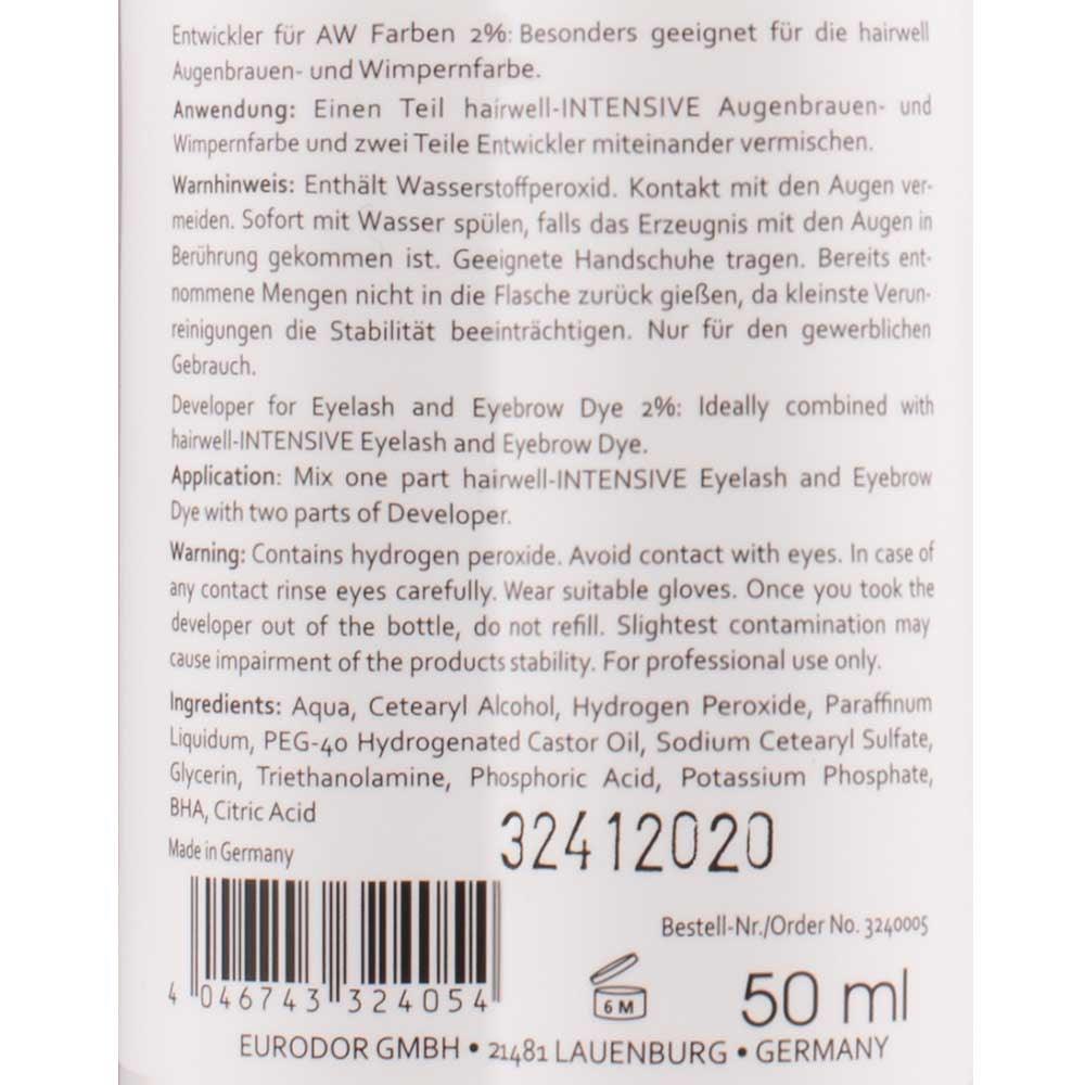 Formulated to be used with Hairwell Eyelash Eyebrow Tints. Professional cream based formula allows for unsurpassed control of application and provides more security than using liquid developers, minimising spills or staining around the eye area! Creates intense colour that lasts between 4-6 weeks. Easy to apply 50ml dropper bottle provides up to 100 colour applications.