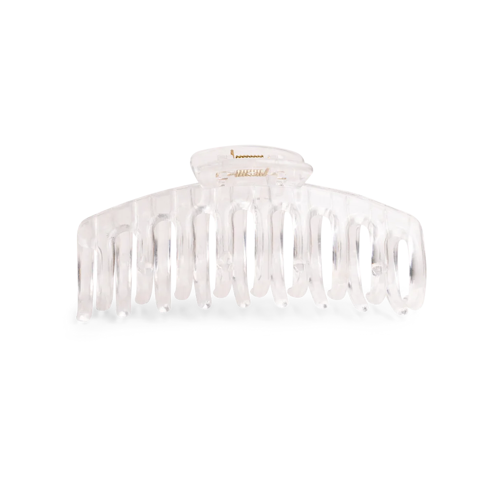 Bringing back the 90s with the Mermade Claw Clip in clear. The barrel claw hold is made with 100% plastic and designed with smooth edges so it won’t rip or damage hair. It's fairly large in size, so you can clip up a long pony or a thick mane. Get ready in style as you prep your hair, or wear it out on the town for a casual-cool statement.