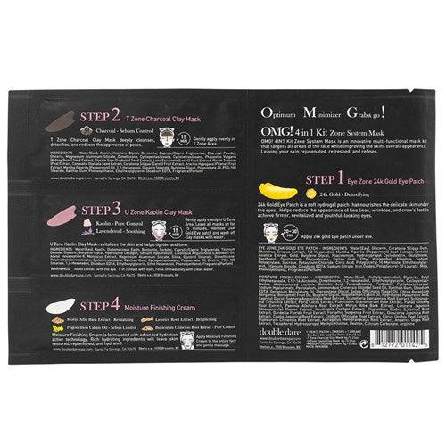 OMG! 4 In 1 Zone System Mask is an easy to use, mess-free and fun face mask kit that helps deliver full face revitalisation. Start with the Eye Zone 24k Gold Eye Patch, then apply the T Zone Charcoal Clay Mask. Finish with the U Zone Kaolin Clay Mask, followed by the Moisture Finishing Cream.