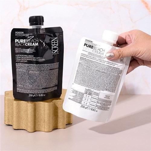 Screen Pure Hair Bleaching Cream Black delivers intense lightening with cold tones. Thanks to special grey micro-pigments, this hair bleach cream effectively counteracts unwanted yellow tones in lightening. Gentle on hair, it’s great for all bleaching techniques and all natural hair colour levels. Fructose and maltose oligosaccharides improve performance, while active vegetable carbon preserves hair’s integrity and hydration. Simple, fast mixing for maximum lightening power with cold tones.